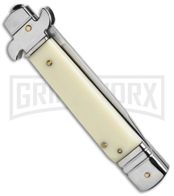 This 8″ Leverlock knife has a sim ivory handle and a satin finished bayonet blade.