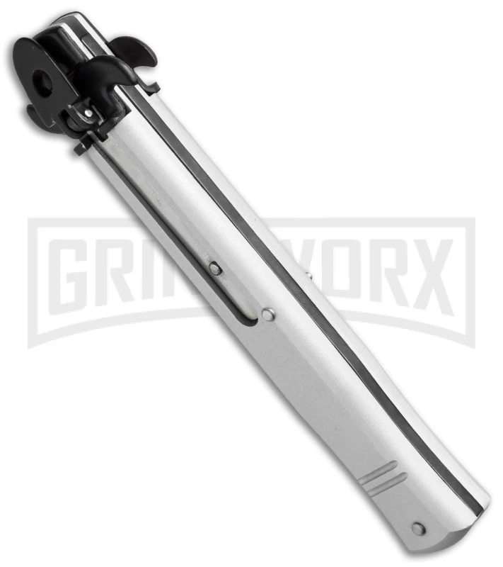 AKC 9″ Tactical Leverletto Silver Automatic Knife – Satin Flat Grind