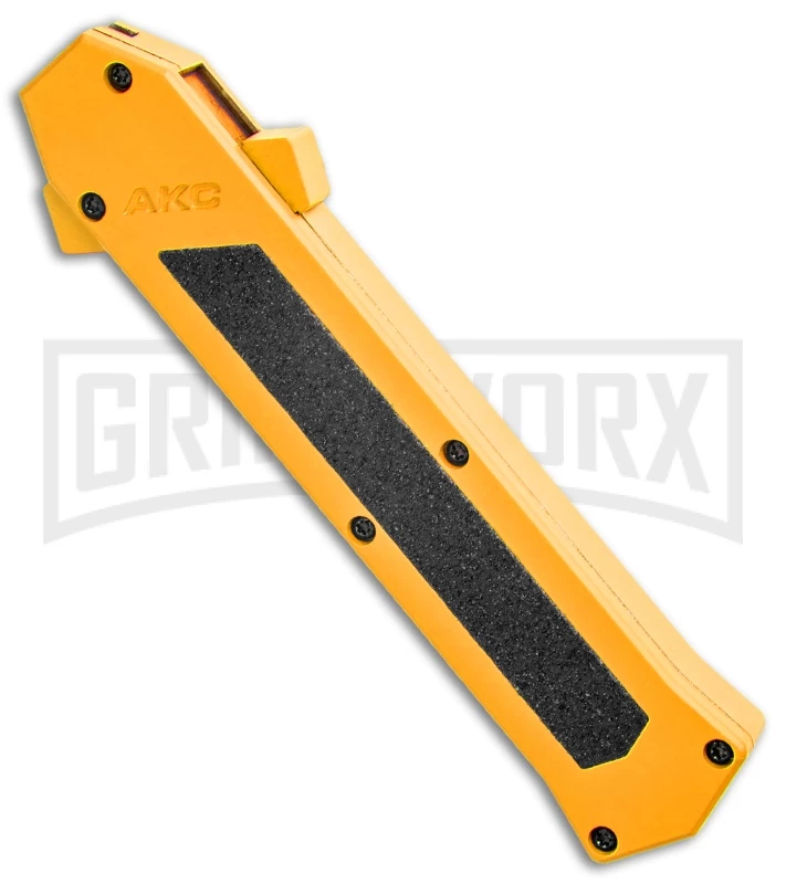 The AKC F-16 is a snappy, double-action OTF automatic knife inspired by the impressive F-16 jet of the same name. It has a side loaded thumb-slide that opens and closes the blade with smooth precision. The handle is made from aluminum with a stainless steel pocket clip for tip-down carry.
