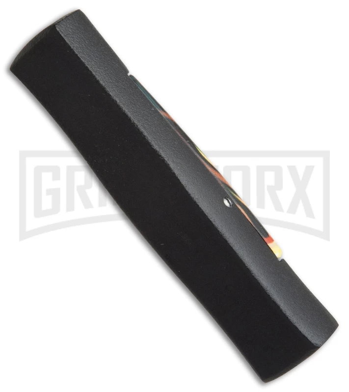 This Minion has a black finished, flat ground, spear point blade. The aluminum handle is black with a flame acrylic insert.