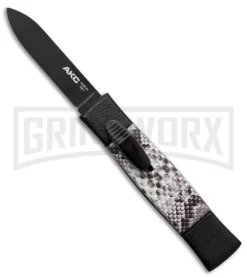 This Minion has a black finished, flat grind, spear point blade. The aluminum handle is black with a faux snake skin insert.