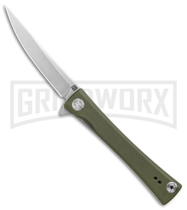 This Artisan Cutlery S Waistline has a stonewashed blade and a green G-10 handle.
