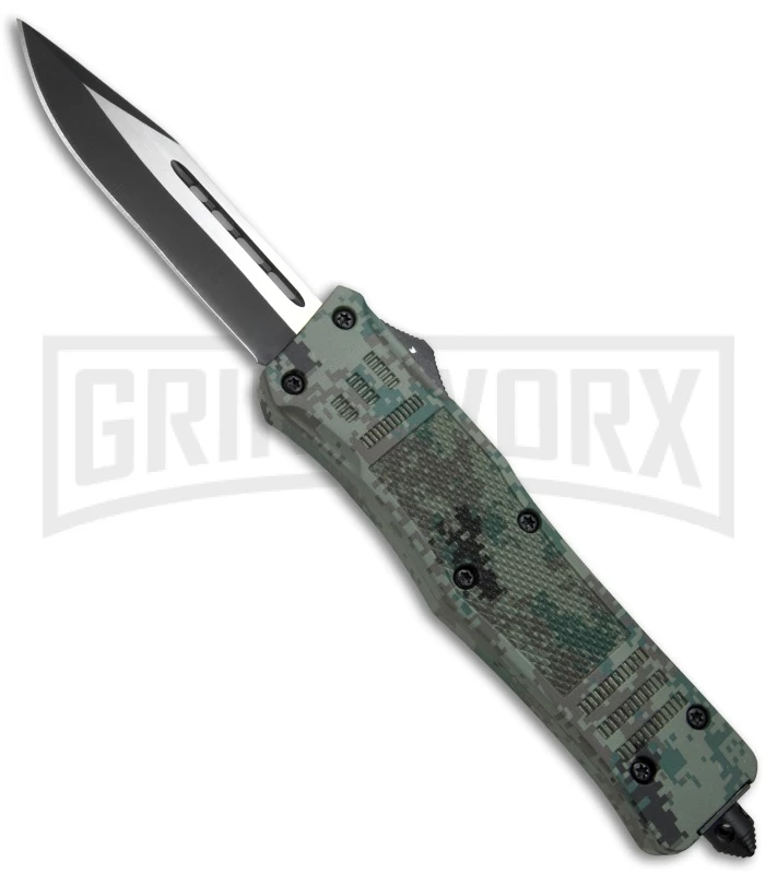 This Atomic OTF model has a digi-camo handle and a two-tone clip point blade with a plain edge.