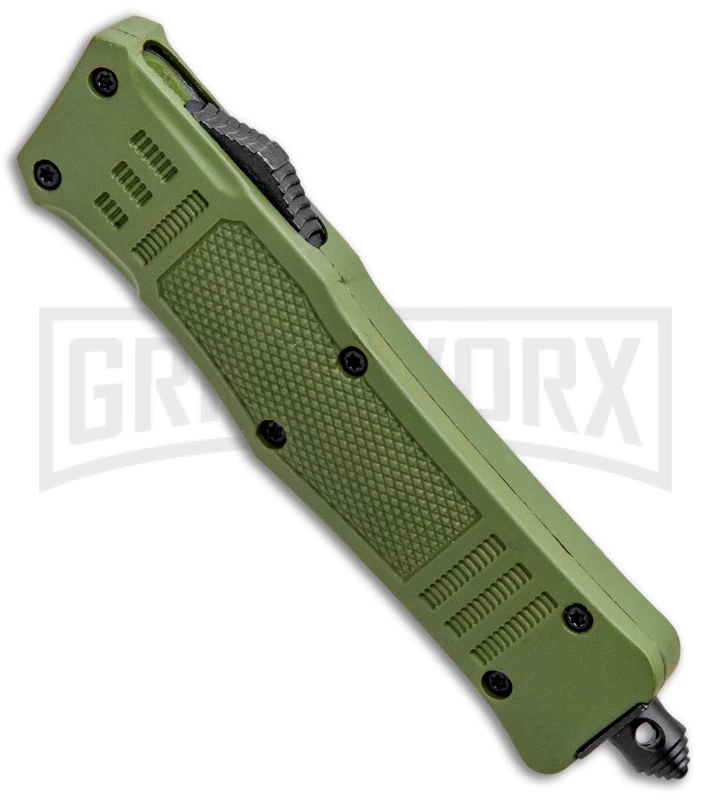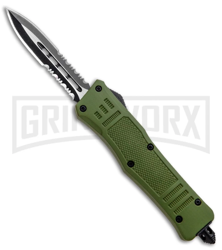 This Mini Defender model has a two-tone dagger blade with a partially serrated edges and an OD green handle.