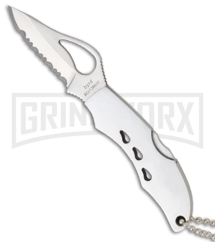 This Finch model is the smallest knife offered from Bryd Knives. The Finch features an 8Cr13MoV blade with serrated edge and a thumb hole opener. It has a stainless steel handle with a secure lockback mechanism. Item is outfitted with a bead ball chain for convenient EDC.
