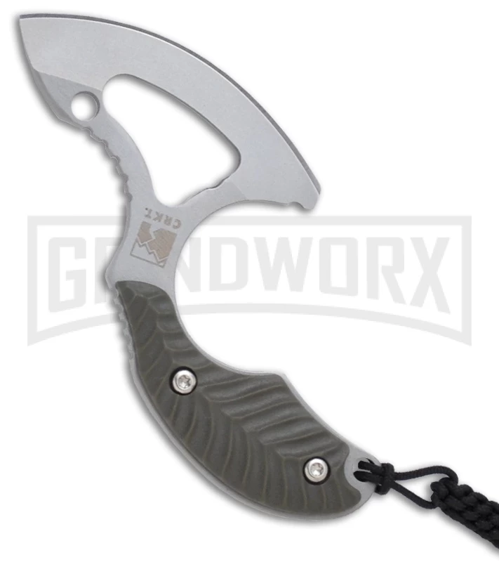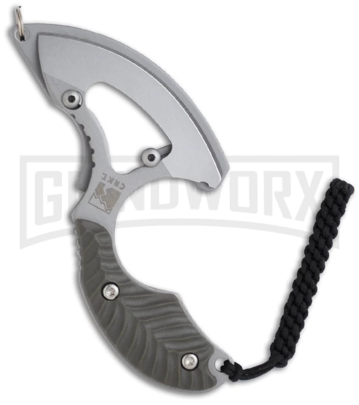 CRKT translated Flavio’s custom design into the affordable production version you see here. The knife itself is a full-tang skeletonized piece of high-carbon 1.4116 stainless steel. The 2.0″ blade is hollow ground on the right side to a full curved skinner profile with a Razor-Sharp edge and bead-blast finish. This is a versatile shape which is useful for hundreds of daily cutting tasks. Best of all, the knife alone weighs only 0.8 ounce, making it the lightest fixed blade we have ever produced. Flavio’s genius comes through in the integrated design of the blade and handle, which allows a secure and comfortable grip that is rarely found in such a small knife. He achieves this through the use of carefully-thought-out details: a deep wrap-around index finger groove, a castellated notch at the thumb, and a slight handle swell with dark green injection-molded Zytel scales.