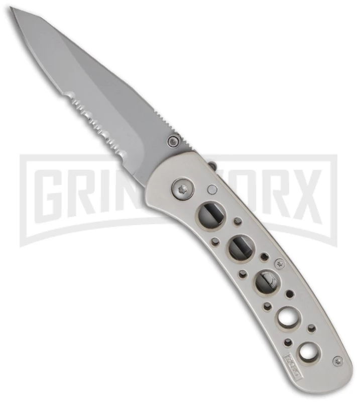 The handle features CRKT’s InterFrame locking liner in an open build design for easy cleaning. The dual liners are 420J2 stainless steel. Friction grooves at the lock and on the blade spine improve grip in wet and icy conditions. The nickel chrome plated zinc alloy scales have a “skeleton” design. Integrated into the design is CRKT’s patented LAWKS safety, which effectively converts your folder into a virtual fixed blade when the lever is slid forward. All fasteners are Torx, for easy maintenance, such as tightening the pivot screw for proper blade tension. Includes a tip-down pocket clip.