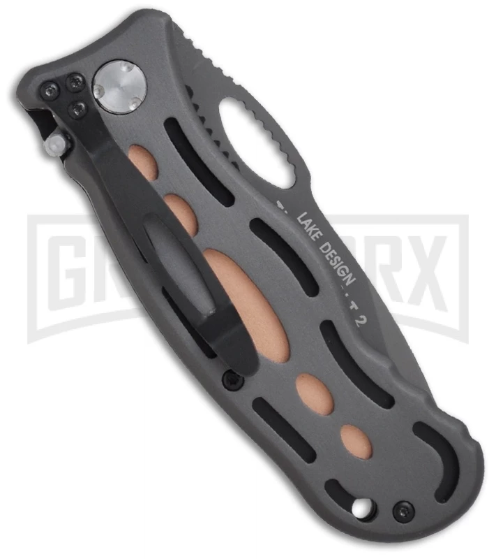 The Thunderbolt has an InterFrame build with stainless steel liners, one locking, and CRKT’s patented LAWKS safety. Ron Lake designed this ergonomic handle with a center swell and grooved areas at the thumb and pommel. The 6061 aluminum scales are anodized charcoal gray with bronze anodized inserts that provide a nice contrast. The pocket clip, like the stainless steel frame is black oxide finished. The dual-grind Tanto-style blade is 8Cr14MoV stainless steel with a non-reflective black oxide coating. Fast one-hand opening is accomplished by a large oval thumb hole.