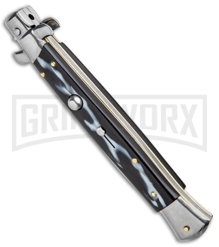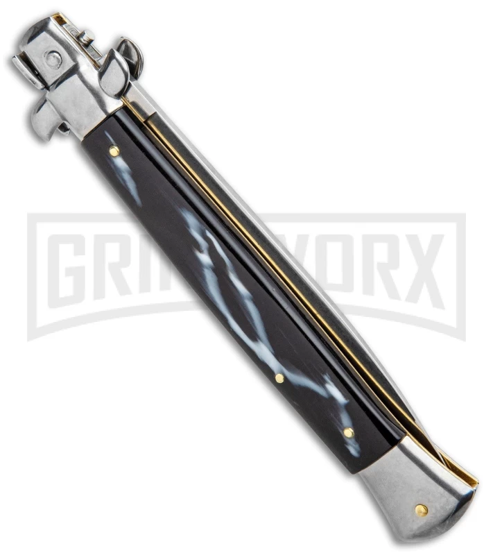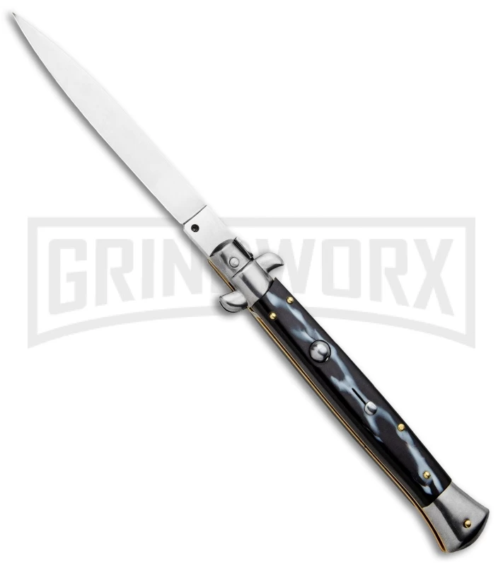 This classic Italian stiletto has sim dark horn scales and a stainless spear point blade. The knife features fast auto action and lock-up from the push button, and protection against accidental release with the sliding safety. Polished bolsters and hardware make this a beautiful addition to your Italian collection.