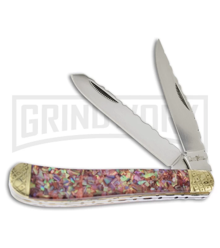 The Frost Cutlery Cherokee Stoneworks Trapper is a traditional pocket knife with two blades, with unique file work on the backspring. The trapper knife style has been around for over one hundred years and was originally meant as a tool for skinning small game, now it would be perfect for any day to day tasks with a traditional look. This knife has two stainless steel blades, one clip point and one spey, both with a satin finish. The handles are pink cracked simulated abalone with embossed nickel silver bolsters.