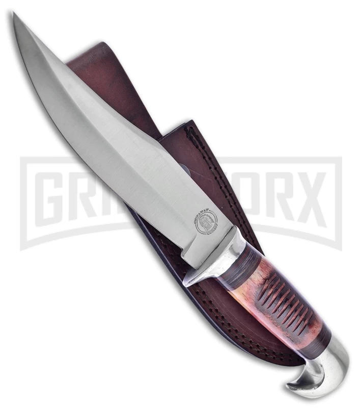 The Frost Cutlery Chipaway Grande Basin is a fixed blade knife great for hunting. This Bowie styled knife is the one that will leave you impressed with its cutting control and strength. It is excellent for field dressing game, skinning that big buck, trophy elk, or any of the day’s kill. And if you should find yourself in a threatening situation this will leave an attacker questioning his decision. The stainless steel blade is satin finished. A nickel silver guard and pommel is at each end of the handsome bone blade. Included is a brown leather belt sheath and it comes to you boxed.
