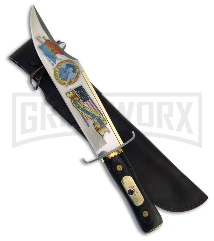 The Frost Cutlery Custer’s Last Stand Bowie is a fixed blade knife that will make an excellent addition to your Colonel Custer collection. The stainless steel, clip point blade has a satin finish and colorful Colonel Custer artwork. The handle is made of brown pakkawood and features an inlay shield. It also has a stainless steel guard and brass pommel. It comes with a brown leather belt sheath.
