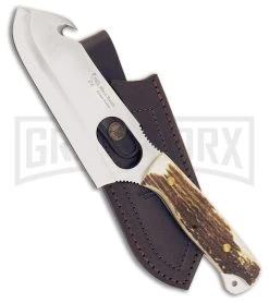 The Frost Cutlery Hen & Rooster Butcher is a fixed blade knife for hunting. The full tang, stainless steel, gut hook blade has a satin finish. The handle is made of stag antler. It features a lanyard hole and comes with a brown leather belt sheath.