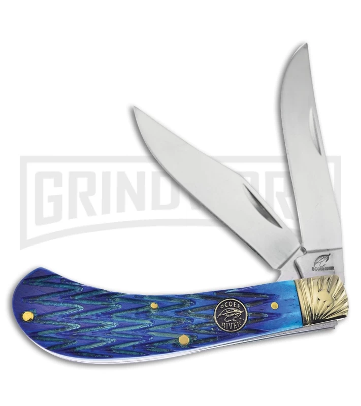 The Frost Cutlery Ocoee River Saddlehorn is a traditional pocket knife for everyday carry. The stainless steel clip point blades have mirror finishes and nail nick openers. The handle is made of blue jigged bone with nickel silver bolsters and an inlay shield.