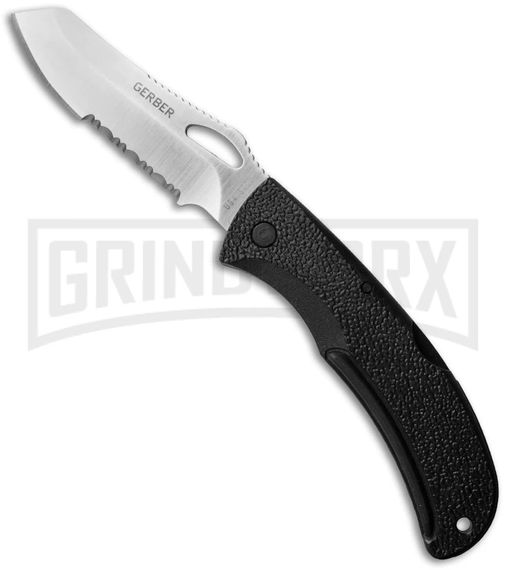 The Gerber E-Z Out DPSF has a practical design and rugged lockback mechanism for safe us. It features a premium S30V steel blade with elongated thumb hole opener. Jimping along the spine of the blade provides traction in alternative cutting positions. The black handle is made of a fiberglass reinforced thermoplastic and fitted with Kraton strips for a superb grip. The tip-down clip makes this a great everyday pocket knife or something to clip on to other gear. The blade has a satin finish with serrations.