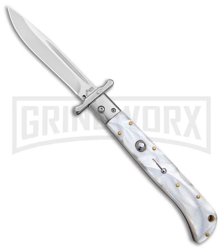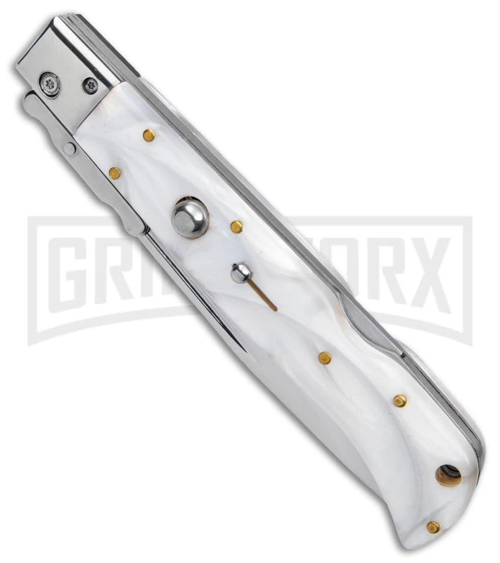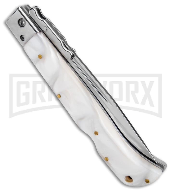 This knife has a white pearlex handle and a drop point blade.