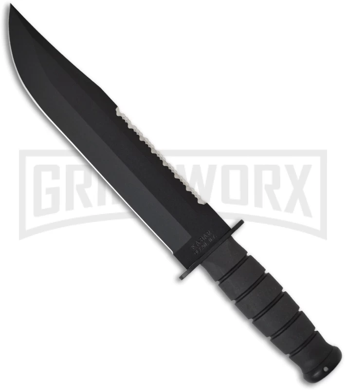 The Big Brother from Ka-Bar features their famous oval shaped handle with Kraton instead of leather. The blade is black coated 1095 Cro-Van steel with a plain cutting edge and serrated upper edge. This knife comes with a leather sheath.