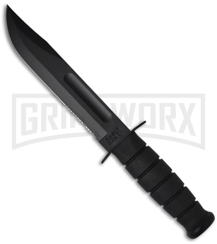 The full-size Ka-Bar, the most famous knife in the World. Features Ka-Bar’s famous oval shaped handles with Kraton instead of leather. This is the same knife design used by the armed forces in World War II. The blade is black coated 1095 Cro-Van steel with a partially serrated edge. This knife comes with a Kydex sheath.