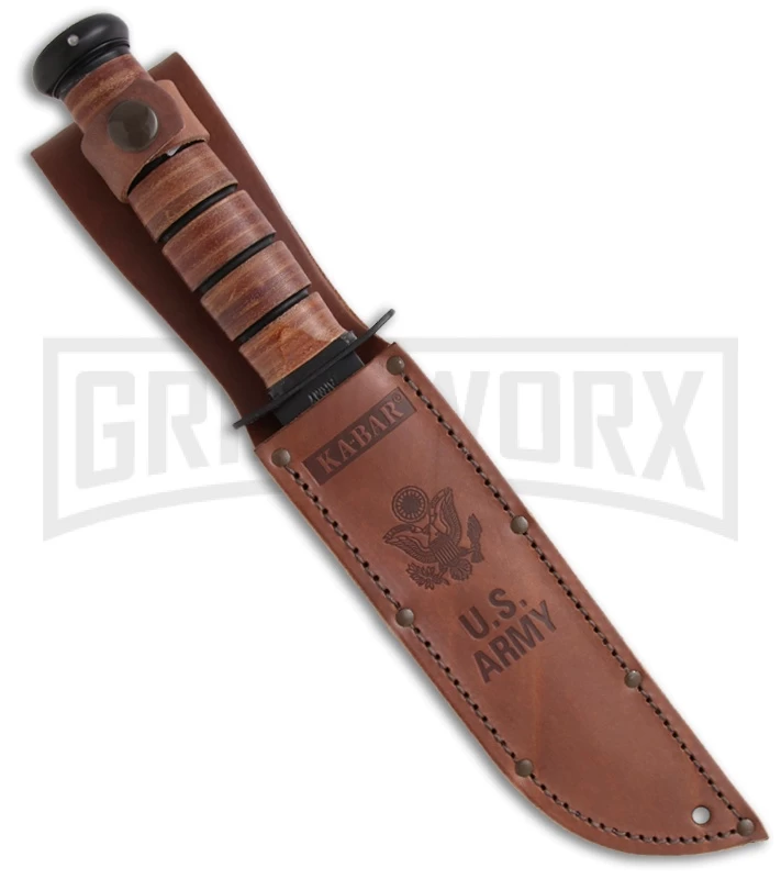 The full-size US ARMY Ka-Bar, the most famous knife in the World, features Ka-Bar’s famous oval shaped leather handles. This is the same knife design used by the armed forces in World War II. The blade is black coated 1095 Cro-Van steel with a plain edge and tang stamped US ARMY. This knife comes with a leather sheath.
