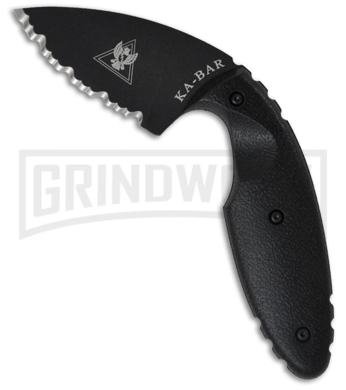 - Black serrated drop point blade made from AUS-8A steel.