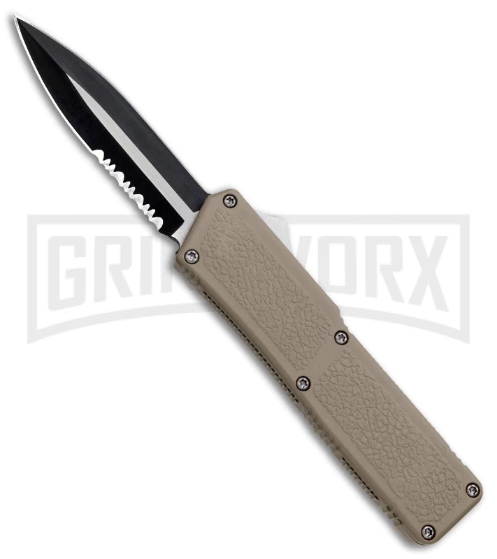 This Lightning model has a tan powder coated aluminum handle with a textured surface to facilitate good grip. The dagger blade is two-tone finished stainless steel with a partially serrated edge. It has a side mounted firing button that makes the Lightning slim and easy to carry.