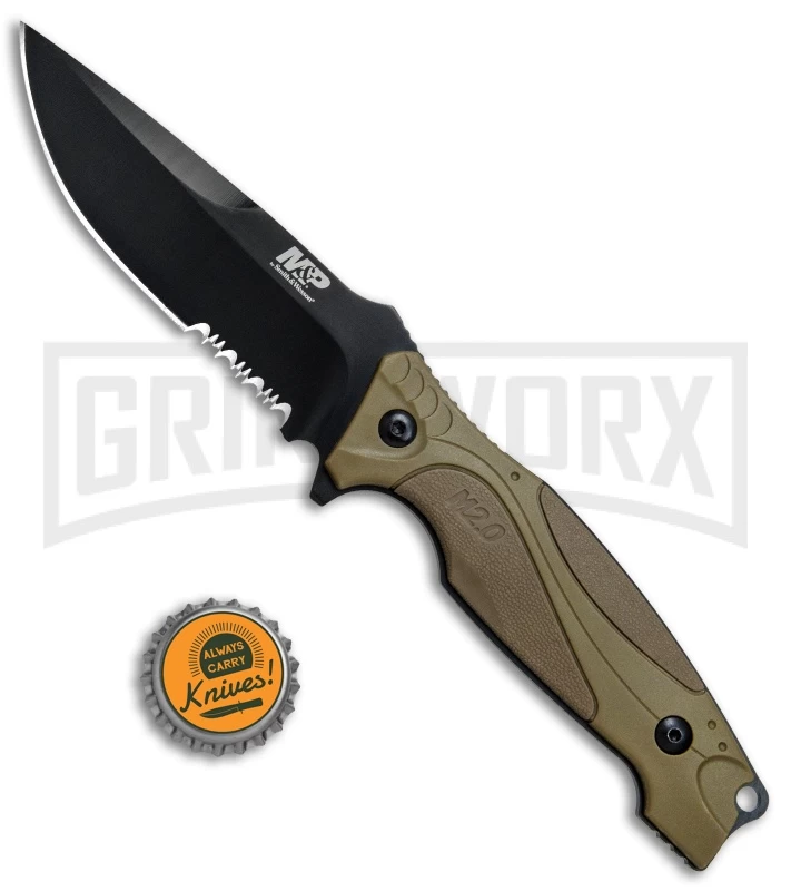 The M&P M2.0 1085880 fixed features a tough fixed blade design with a slim handle for comfortable, lightweight carry. This model comes equipped with a black finished blade with partial serrations and a brown handle. It has a durable polymer handle with rubber inserts for maximized grip performance. The stainless steel blade has a sharp tip and a curved belly for versatile cutting action. Item includes a molded sheath with a stainless steel belt clip for secure EDC.