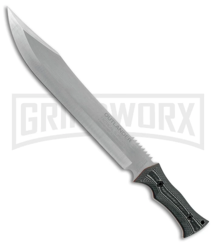 The M-Tech Xtreme Outlander is a tactical machete that is the perfect weapon to control those overgrown bushes or make your way through the woods. The 440 stainless steel, clip point blade has a satin finish with a saw back. The handle is made of black micarta with full tang durability. This also includes a black leather belt sheath.