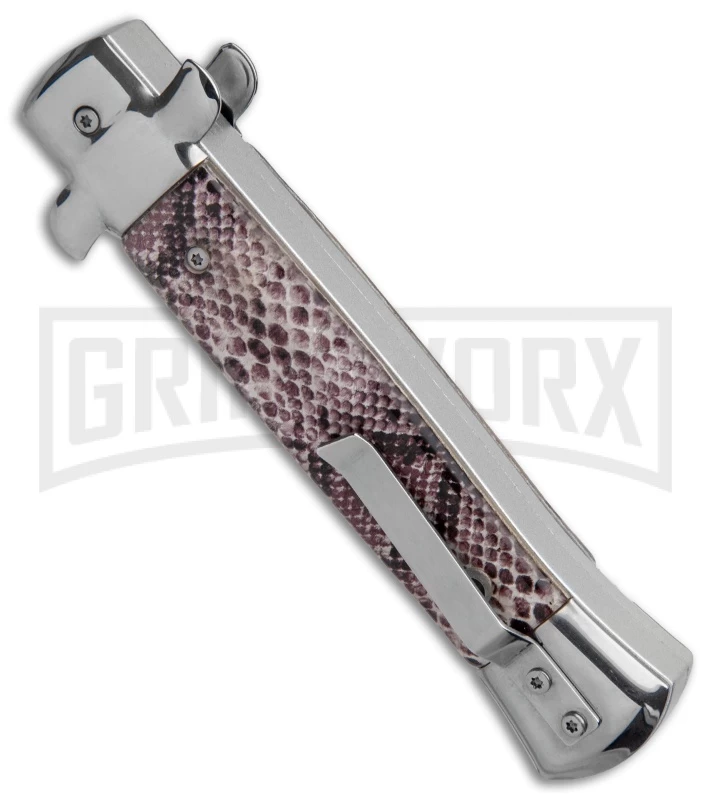 This Mago OTF model features a satin finished dagger blade and an acrylic “Sidewinder” handle.