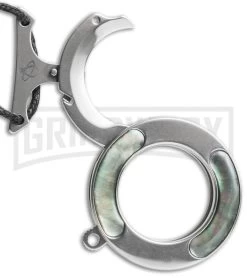 The Vicious Circle is an innovative folding neck knife from Mantis Knives. It has a stainless steel frame with black pearl onlays. The steel frame acts as a sheath system for the hawkbill AUS8 steel blade. It can be worn around the neck and quickly released by simply pulling on the ring (the blade is locked open via an internal liner lock). With a bit of practice the ring can be quickly reattached to the neck chain. Mantis has created an innovative, easy to carry neck knife that wears like an expensive piece of jewelry.