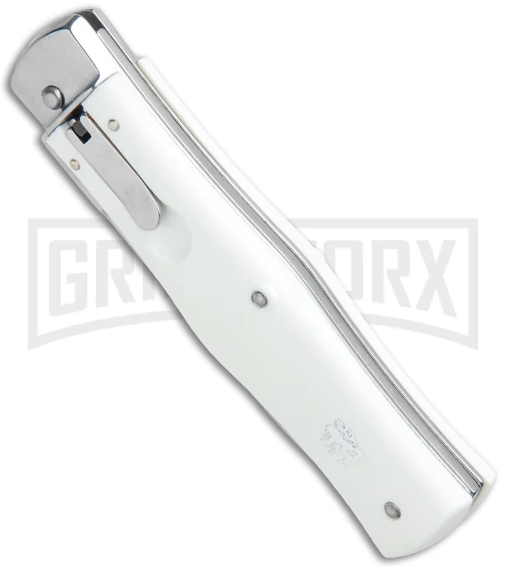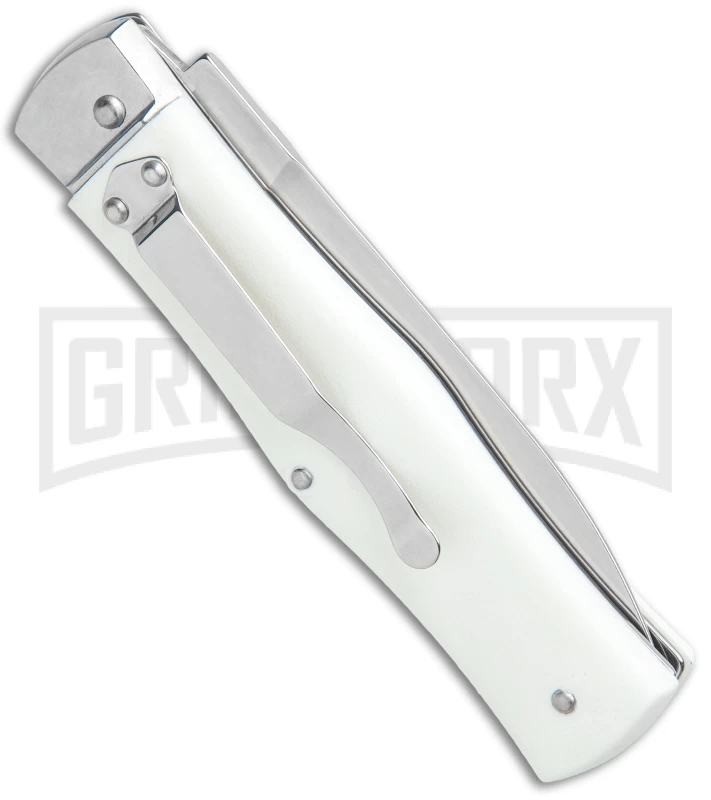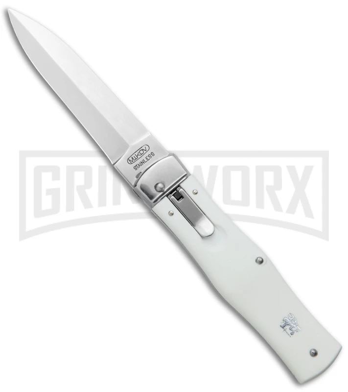The Mikov automatic knives come from the Czech Republic. This model features white ABS scales and a dagger-style stainless blade (one side is sharp and the other is a false edge). The Mikov series is well-regarded for their “ready to work” no nonsense design. Rivet construction. The knife is opened using the small lever near the top of the knife. The lever rests flush in the handle when not in use.