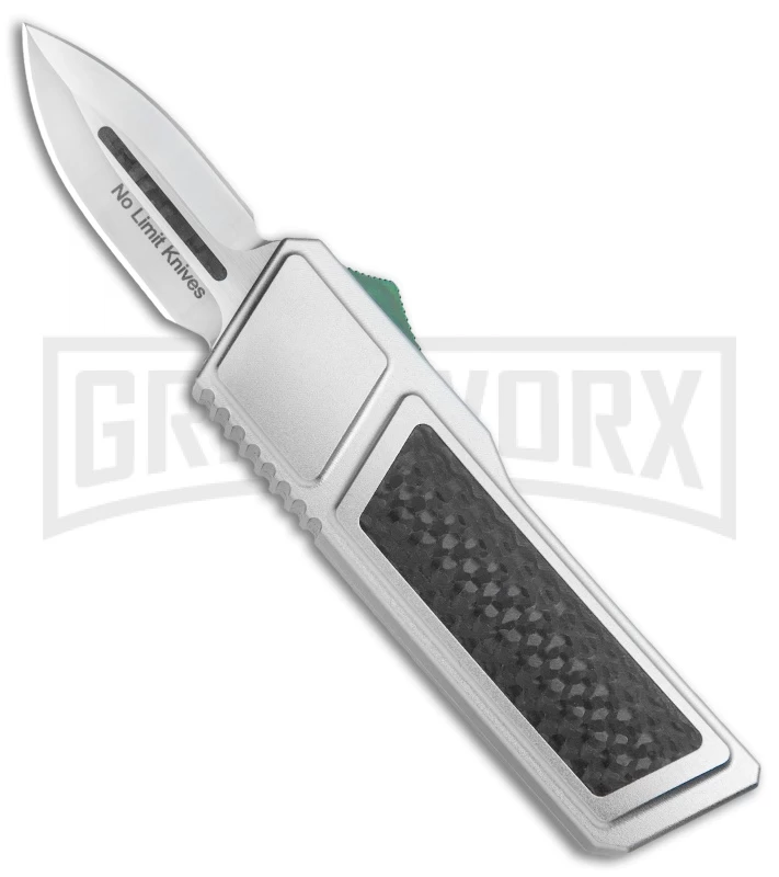 This No Limit Akuma has a silver aluminum and carbon fiber handle and satin finished dagger blade. The hardware is green.