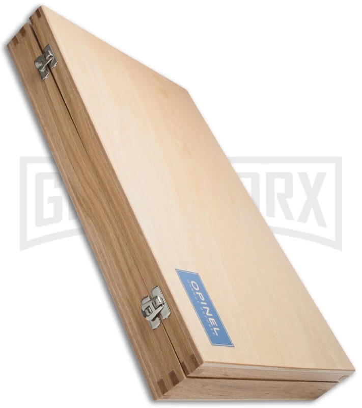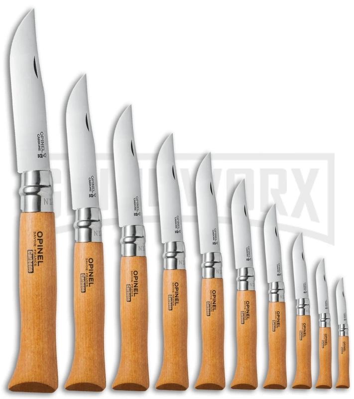 This Opinel collection knife set comes with 10 folding knives (No 2 through No 12) in an elegant wooden gift box. Each folder features a 12C27 Sandvik stainless steel blade, beechwood handle, and the Viroblock safety lock.