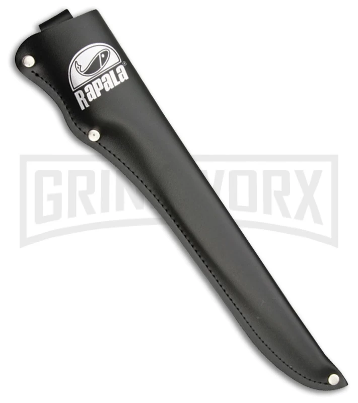 The Rapala X-Large Piranha is a fixed blade knife for cleaning fish. The stainless steel fillet blade has a satin finish. The handle is made of black rubber that features a Rapala logo shield and a stainless steel guard. It comes with a black leather belt sheath and a single-stage pocket sharpener with a red casing.