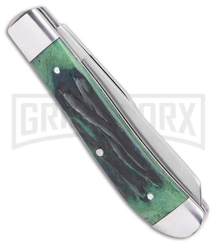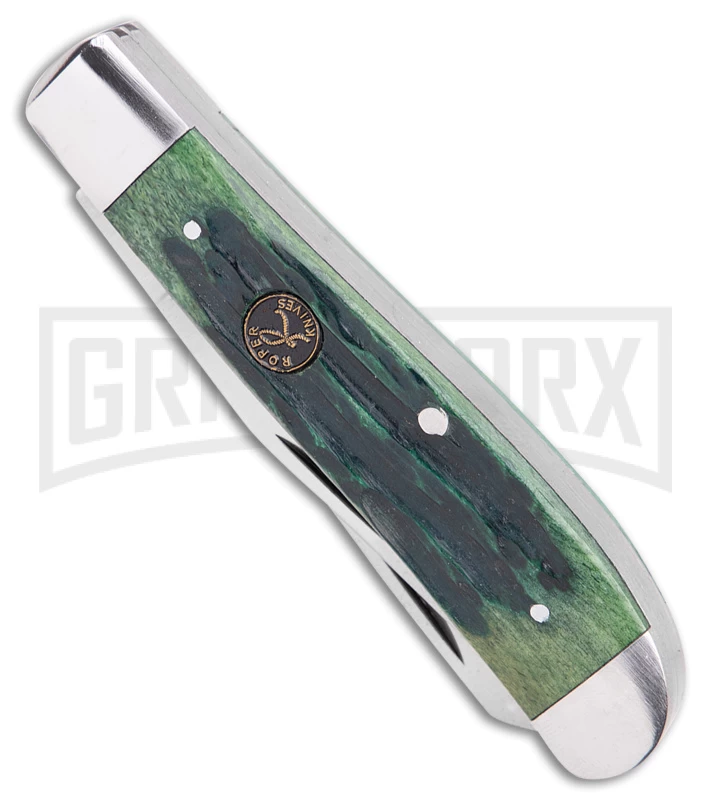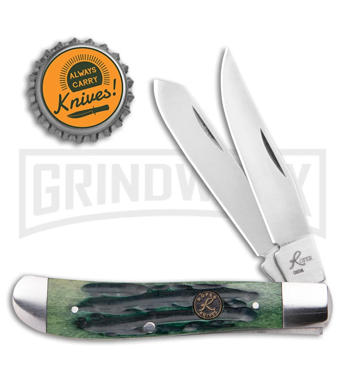 The Roper Knives Trapper is a manual folding traditional pocket knife for everyday carry. The 1065 carbon steel, clip point and spey blades have satin finishes, and nail nick openers. The handle is made of green jigged bone that features stainless steel bolsters and an inlay shield. Like most traditional pocket knives, it has a slip joint.