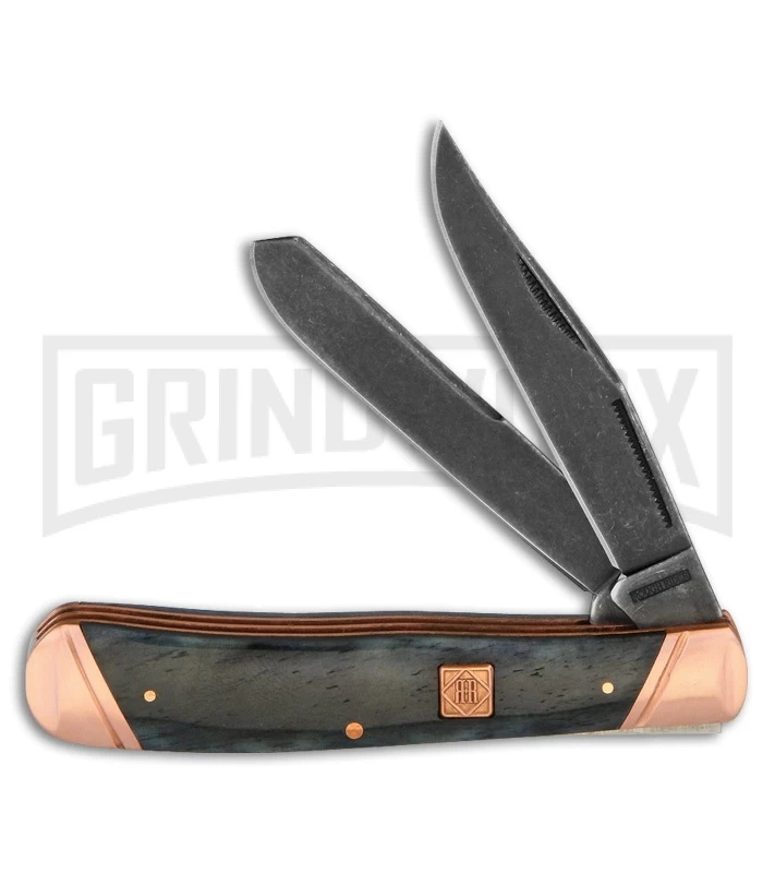 The Rough Rider Lights Out Trapper is a traditional pocket knife for everyday carry. The stainless steel, clip point and spey, blades have black stonewash finishes and nail nick openers. The handle is made of black smooth bone with copper bolsters and an inlay shield. Like most traditional pocket knives, it has a slip joint.