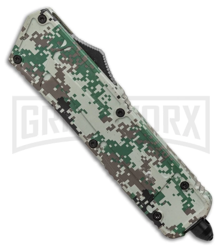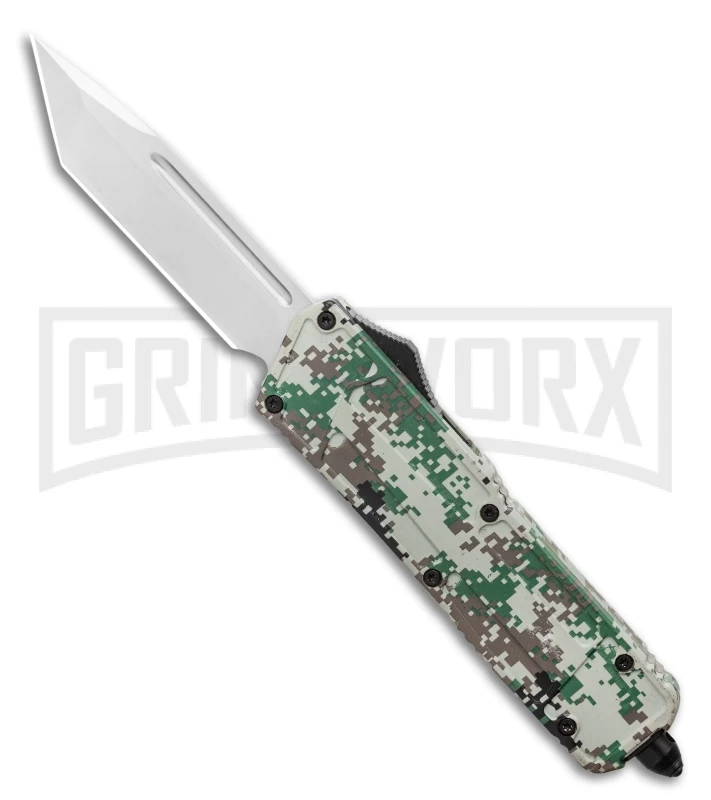 This Rumble model has a digi-camo finished body and a stainless steel tanto blade with a satin finish. The Rumble is a double-action OTF knife with performance you’re sure to enjoy. This automatic knife fires open and closed with the slide of the firing button. Item includes a glass breaker tip and a tip-down carry pocket clip.