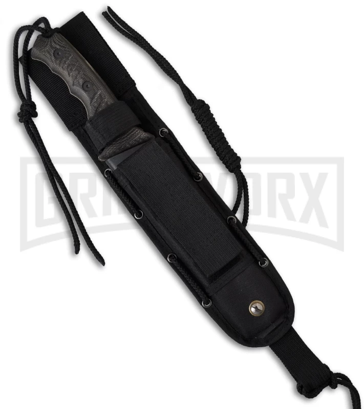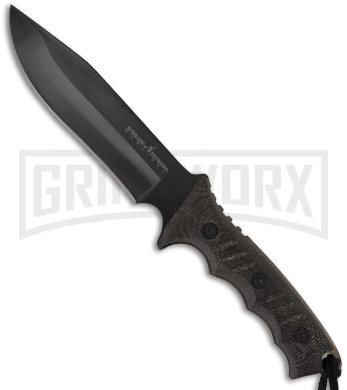 This Schrade Extreme Survival fixed blade is a big knife for outdoor adventures. It features a black coated drop point steel blade. The full-tang design is coupled with grooved Micarta scales. The handle has a deep finger pattern and jimping on the spine for secure grip. Included is a black nylon sheath with plastic insert.