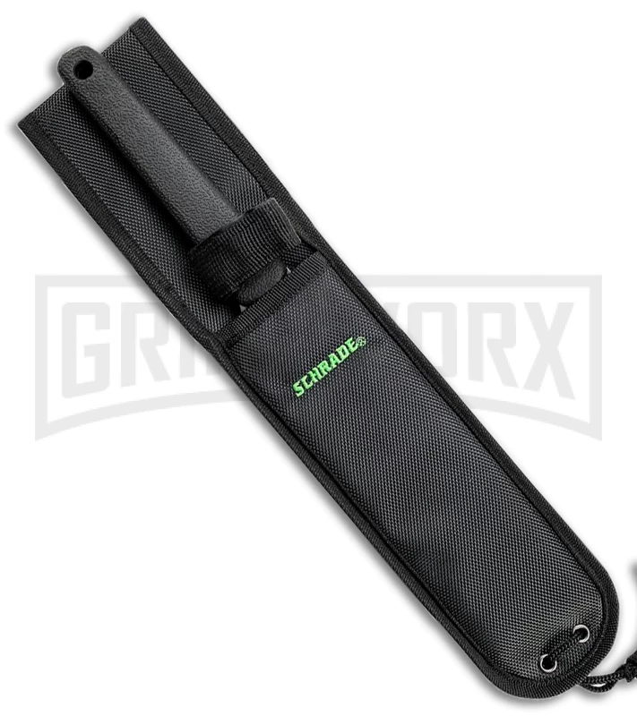 The Schrade FROE comes equipped with a tough cleaver style blade for all of your chopping needs. It has a 1070 high carbon steel blade with a durable gray coating and a plain edge. A molded black TPE handle provides a firm grip for your most difficult cutting jobs. The FROE includes a heavy duty nylon sheath with a velcro strap and a belt loop.