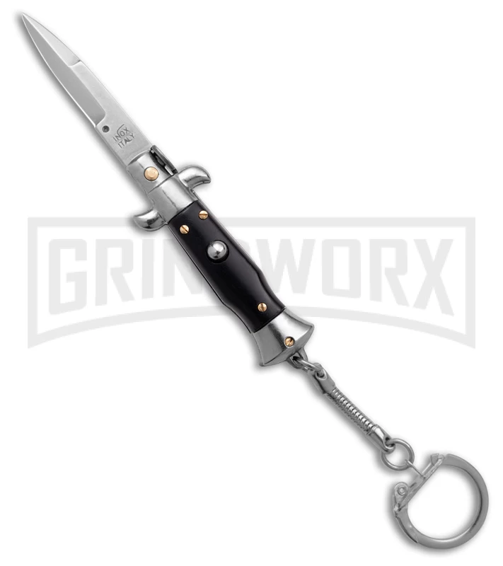 Italian history in the palm of your hand! This stiletto keychain is a unique conversation piece and sure to be the envy of your friends! It measures just 4″ long when open and weighs just under an ounce. It has a flat grind, polished, stainless steel blade, polished bolsters, a push button release with quick action, and secure lock. The black handle scales give it a classic look, and the tang is stamped “Inox, Italy.”