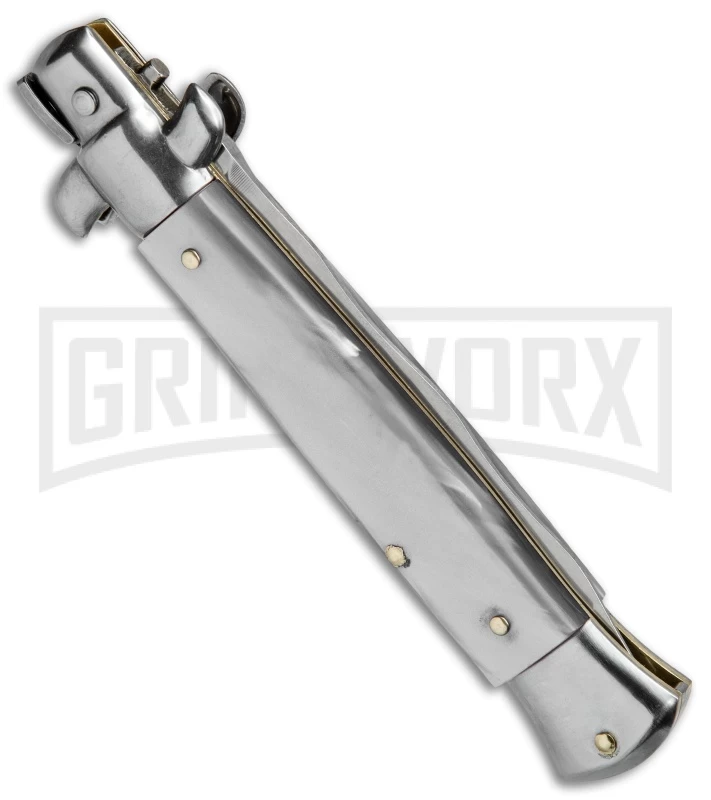 The SKM/AB Fantasy stiletto features eye-catching white pearlex handles. This model is equipped with a stainless steel kris style blade in a polished satin finish. The sliding safety, firing button and bolsters are made from polished nickel silver, which adds an elegant and collectible appearance to the piece. SKM/AB Stilettos are genuine Italian-made products that have “AB Italy” stamped on the tang of each blade. Add an authentic Italian stiletto to your knife collection today!