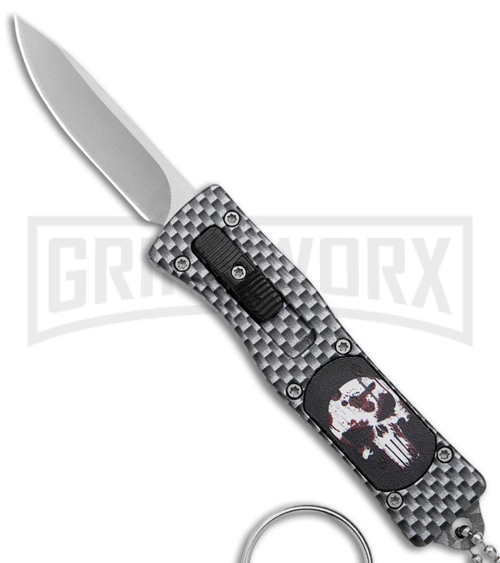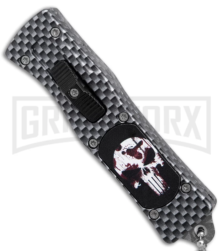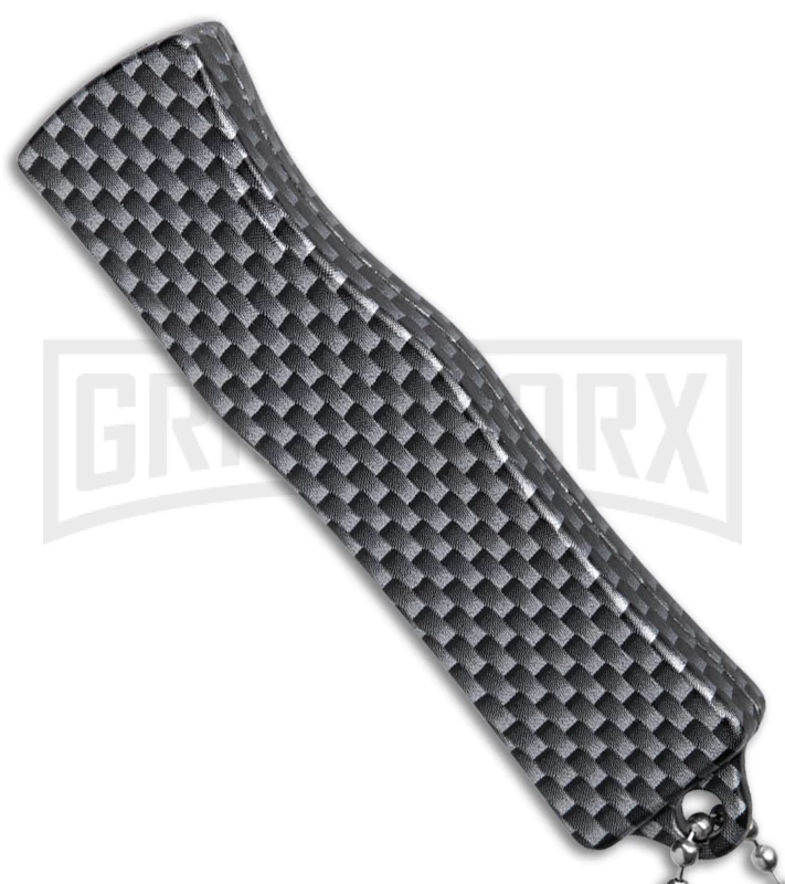 The Mini Dog Tag is an out-the-front automatic double-action knife that has a tip-down stainless steel drop point blade. The carbon fiber handle has a thumb slide opener and and retractor.
