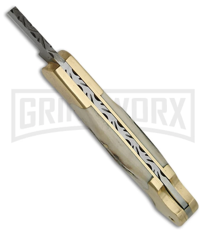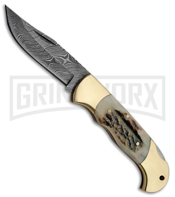 Tallen Caravan Brown Stag Bone Lockback Knife – Damascus Plain