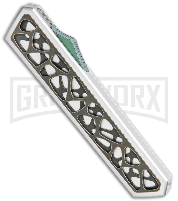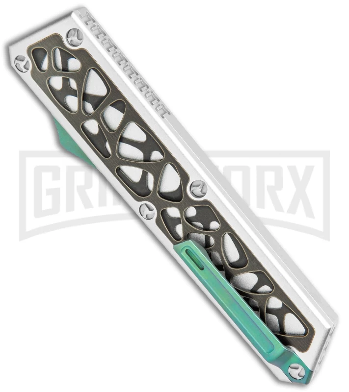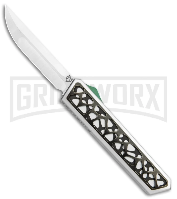 The Vespa Knives Dark Star OTF is a beast of a knife. Far from other fun, but wimpy OTF knives, this bad boy is built with the best materials and tight tolerances. To start, the compound-ground blade is made from Bohler M390 super steel. This steel is capable of holdings its edge far longer than and is far tougher than ordinary stainless knife steels. Next is the remarkable handle: the net-like inlay is titanium, and the thumb slide and pocket clip have been anodized to add that extra flare. The Dark Star OTF is perfect for collectors or those just looking for a workhorse of a knife.