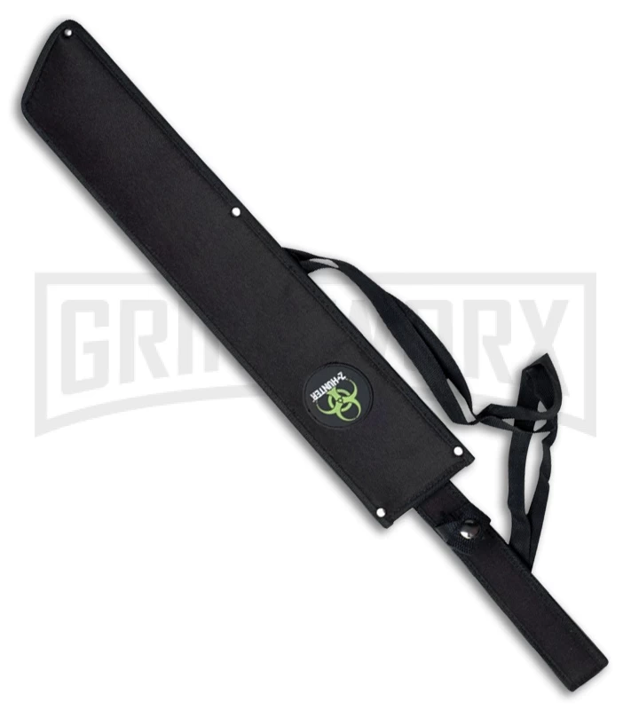The Z-Hunter Liquidator is a machete knife for tactical use. You will feel large and in charge carrying this. The black, stainless steel blade has a chopping fully serrated bottom edge, an integrated finger guard, and a sawback. The handle is neon green cord wrapped and has a lanyard cord. Included is a black nylon belt sheath with a rubber patch logo and an adjustable shoulder strap.